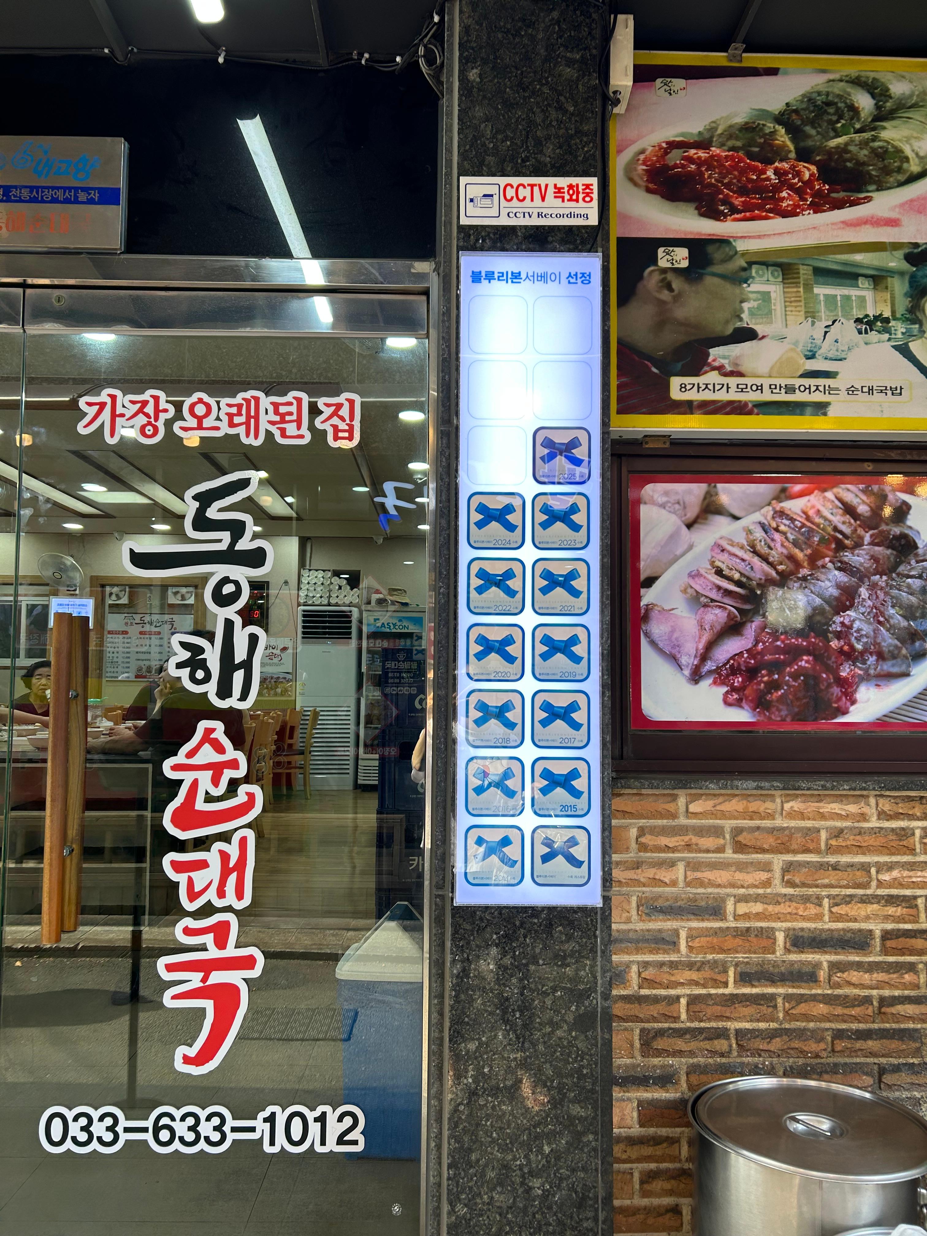 서울에서 출발해 속초에 도착하면 아침 식사로 뭘 먹을까 항상 고민하게 되요. 저도 이번엔 색다른 메뉴 먹어보고 싶어서 속초시장에 순대국 골목이 있는 걸 기억해서 가봤어요. 속초 시장 순대국 골목에 위치한 동해순대국은 현지인과 관광객 모두에게 사랑받는 맛집이더라고요. 저는 잘 모르고 방문했다가 입구에 블루리본 인증이 가득해 가보게 되었어요.
