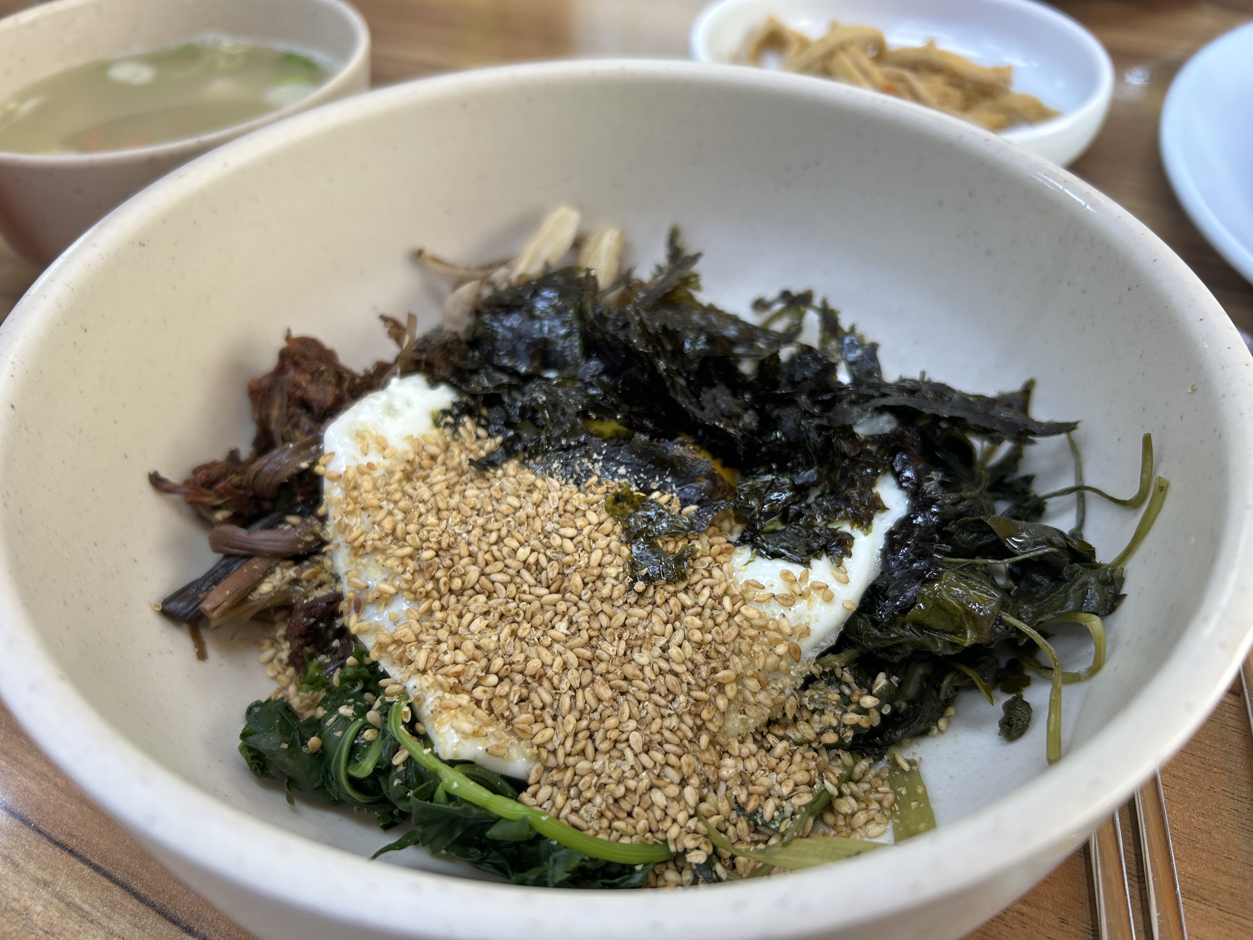 마지막은산채비빔밥이에요. 알록달록 색감부터 눈을 사로잡는데, 신선한 나물들이 듬뿍 올라가 있어 보는 것만으로도 건강해지는 느낌이죠? 고소한 참기름을 살짝 둘러 비벼 먹으니 나물 본연의 향이 살아나면서도 담백하게 어울렸어요. 매콤한 고추장 양념까지 더해져서 입안 가득 조화로운 맛을 즐길 수 있었어요. 속이 편안하고 자극적이지 않아서 여행 중에도 부담 없이 먹기 좋았고, 채식이나 건강식을 선호하는 분들에게도 딱 맞는 메뉴였어요.