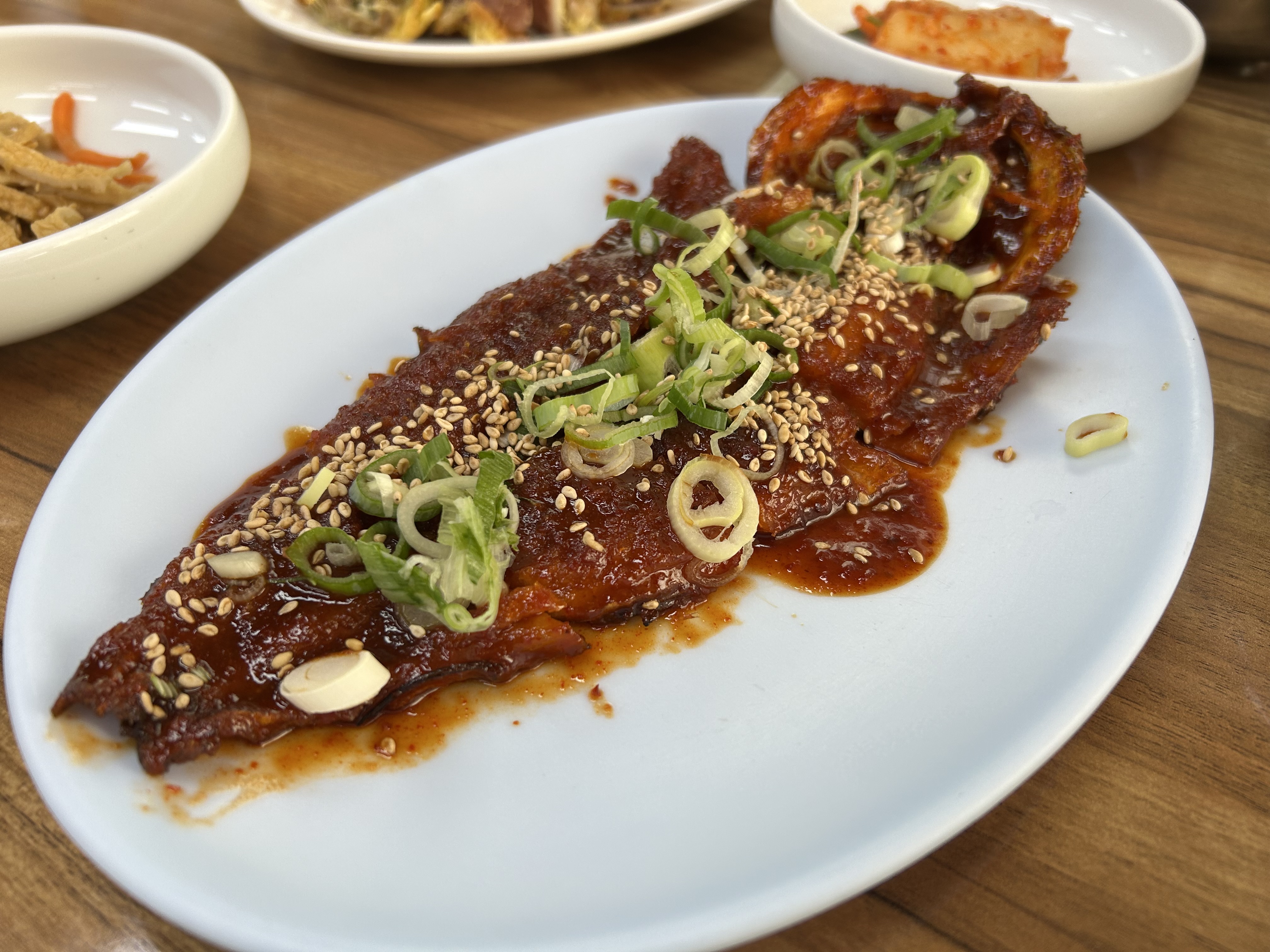 두 번째로 맛본 메뉴는황태구이였어요. 노릇노릇하게 구워진 황태에 특제 양념이 발라져 나오는데, 한입 베어물면 은은한 불향과 함께 고소한 맛이 확 퍼져요. 질기지 않고 촉촉하게 구워져 있어서 씹는 맛이 좋았어요. 그냥 먹어도 맛있고, 밥이랑 같이 먹으면 정말 최고의 밥도둑이에요. 자극적이지 않으면서도 깊은 감칠맛이 나서, ‘이게 진짜 속초에서 맛봐야 할 황태구이구나’ 싶었어요. 식사와 함께 곁들여 드시면 좋을 듯 해요.