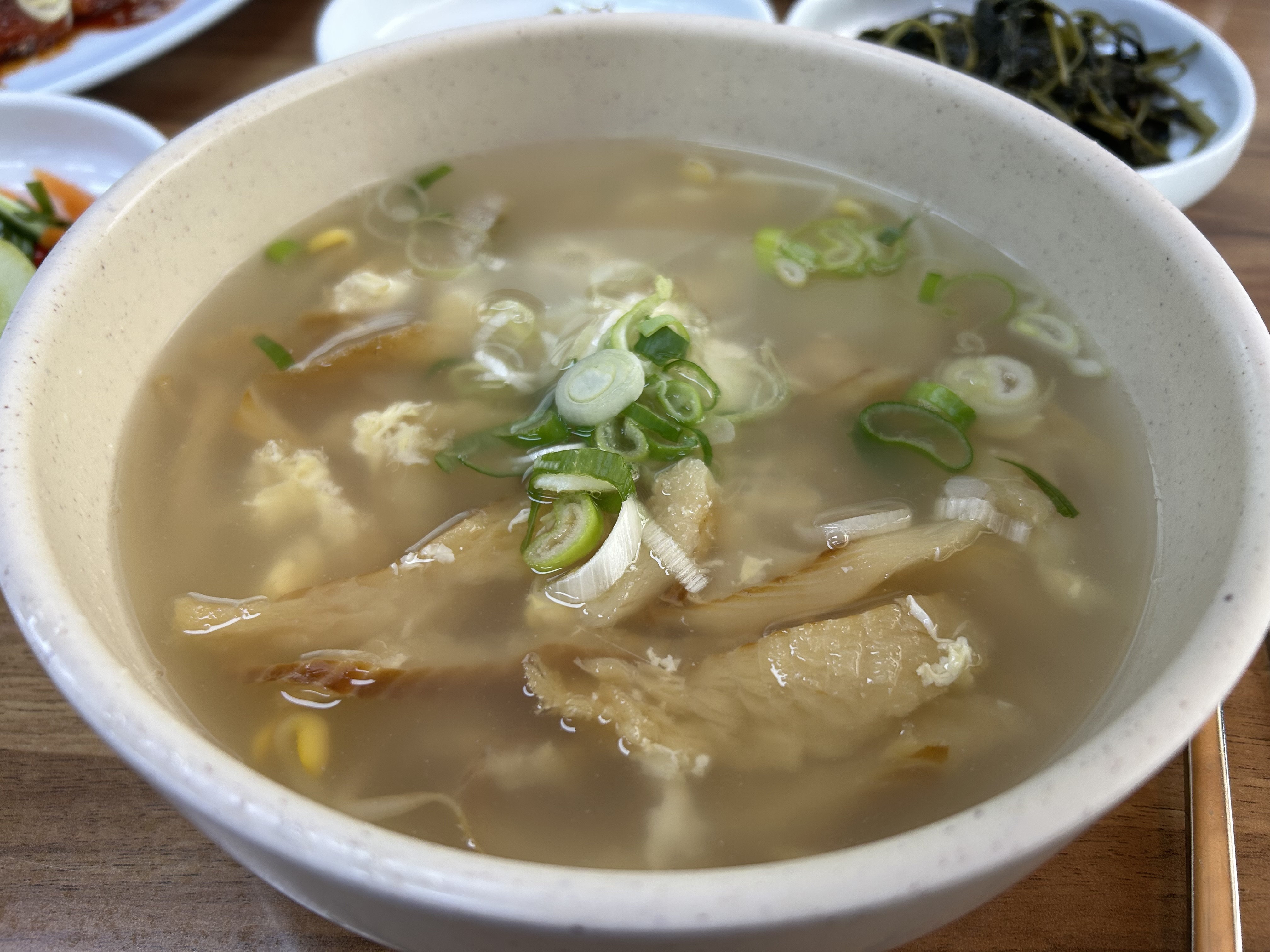 제가 주문한 메뉴 중 첫 번째는 바로황태해장국이에요. 뜨끈한 뚝배기에 보글보글 끓여져 나오는 순간부터 향이 정말 기가 막혔는데요, 진하게 우려낸 육수에 부드럽게 풀린 황태가 가득 들어 있어서 국물 맛이 정말 깊고 시원해요. 특히 술자리 다음 날이나 여행 중 피곤할 때 먹으면 속이 확 풀릴 정도예요. 칼칼하면서도 담백한 맛 덕분에 밥 한 공기를 순식간에 비워버렸어요. 어르신부터 아이들까지 부담 없이 먹을 수 있는 메뉴라 순두부 말고 다른 메뉴 드시고 싶다면 드셔보세요.