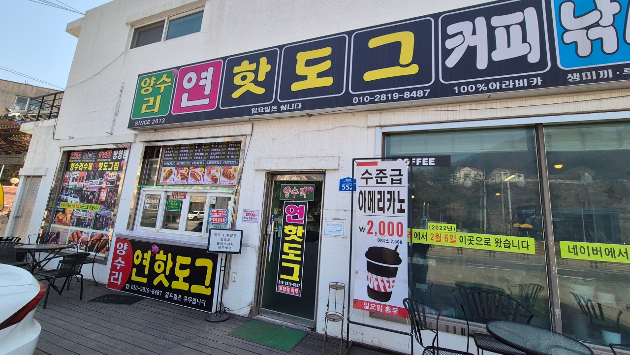 양수리 연핫도그는 이름은 "양수리"지명이 들어가 있지만 양평 양수리에서 가평 청평으로 이사한 곳이에요. 가평 나들이 가는 중 북한강병 대로변에 있으니 무심코 지나게 될 수도 있어요. 방문하시려면 네비게이션을 켜고 가셔서 지나치지 않도록 주의하세요. 발걸 맛있는 즉석 핫도그를 먹을 수 있는 곳이니 가평 나들이 가시면 꼭 연핫도그에서 바삭한 핫도그 드셔보시길 추천드립니다.