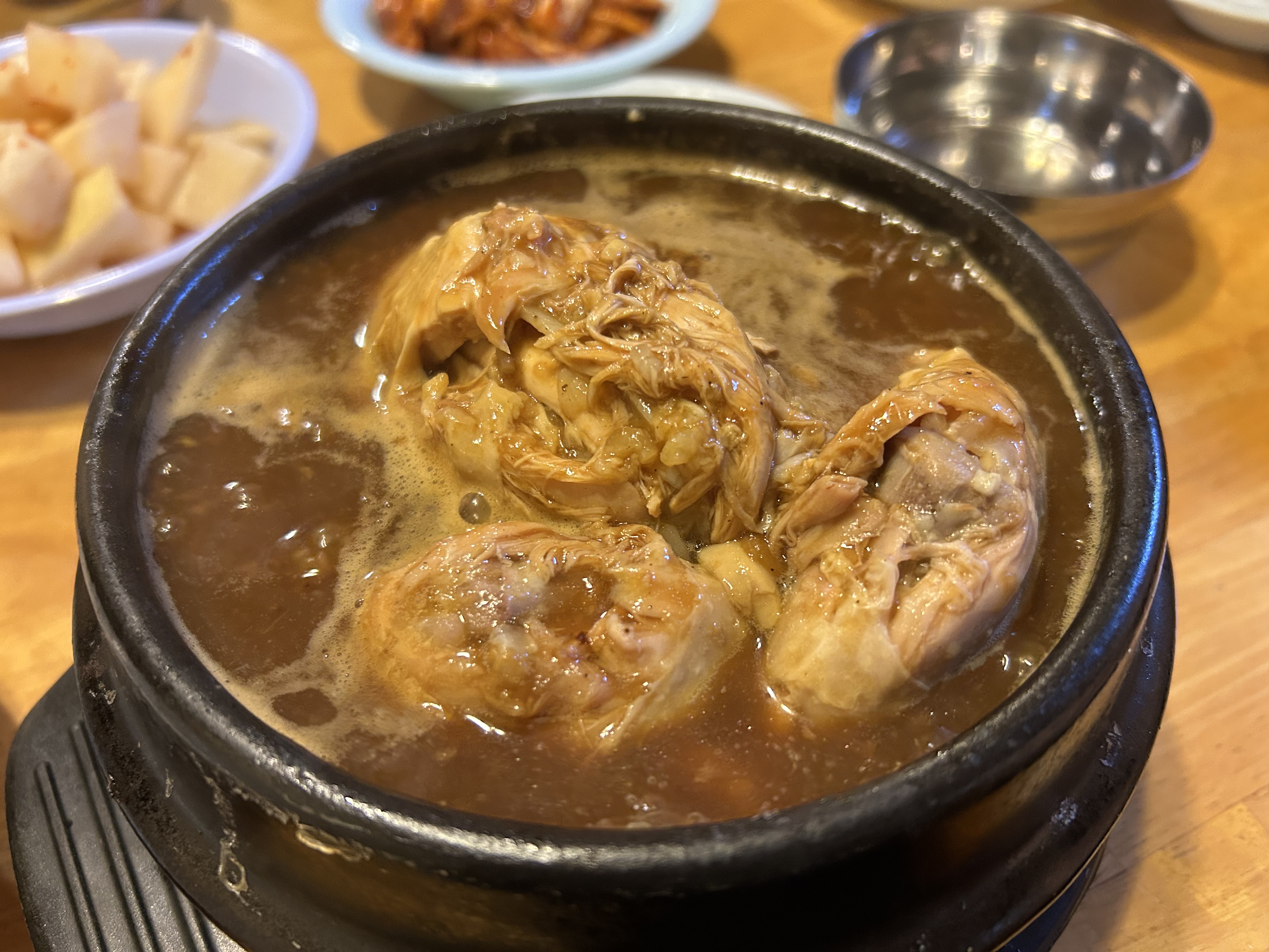 이곳의 대표 메뉴는 역시 옻닭 한 마리예요. 닭고기는 부드럽고, 육수는 갈색에 가까워요. 사실 저는 옻닭을 여기서 처음 먹어봤어요. 옻이 옮기도 한다고해서 무서웠는데 이집은 전혀 그럴일이 없다고 하니 안심하시고 꼭 주문해 보세요.