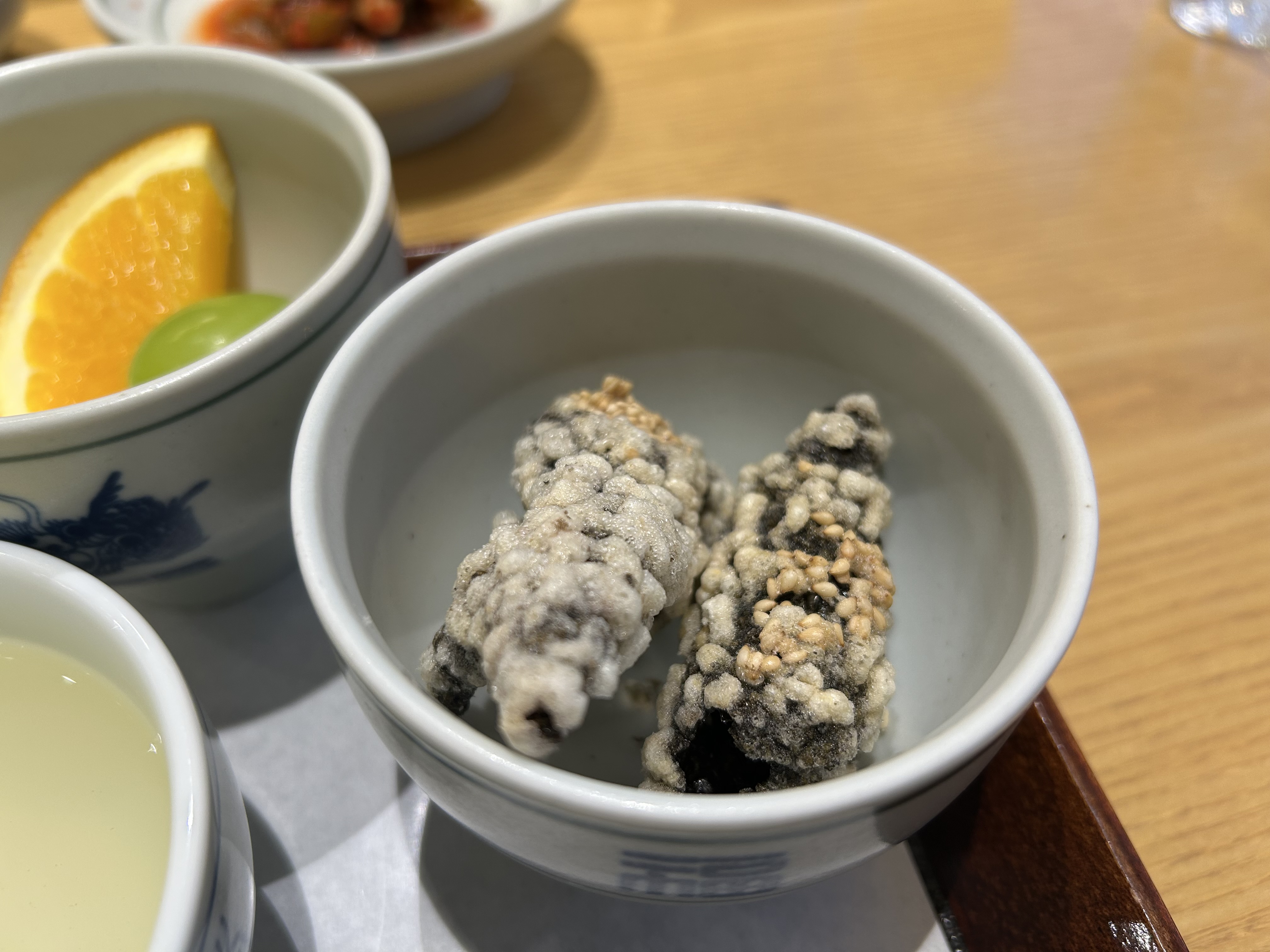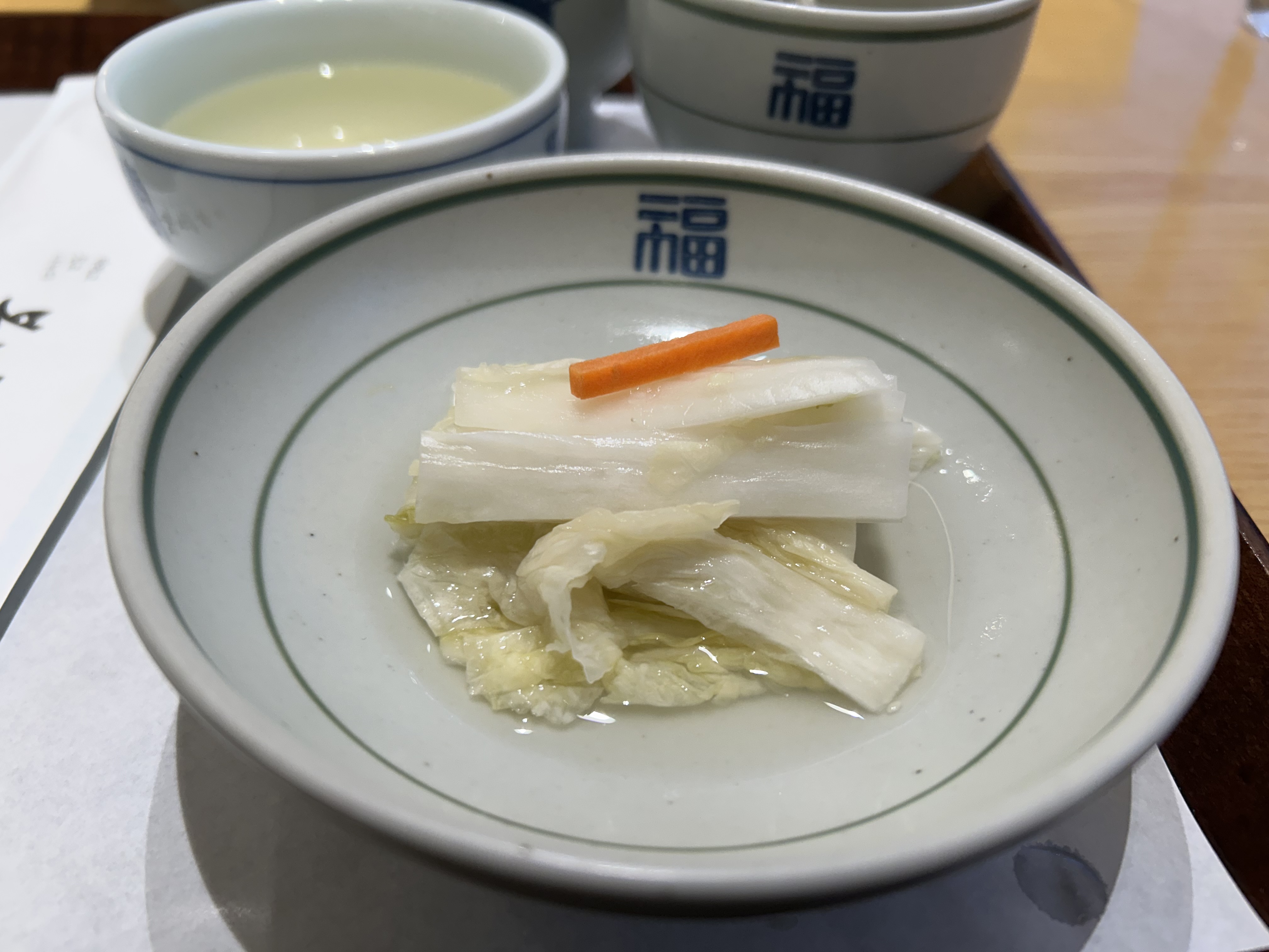 앉자마자 깔끔한 1인 트레이가 세팅되는데, 그 안에 정갈한 앞접시와 수제부각, 과일, 육수가 담겨 나와요. 트레이 구성부터 깔끔하고 정성이 느껴져서 ‘이 집 좀 다르다’는 생각이 절로 들었어요. 특히 갓김치와 무말랭이 무침이 정말 인상적이었는데요, 쉽게 맛보기 힘든 정갈한 반찬이에요. 갓김치는 향이 강하지 않으면서도 아삭하고, 무말랭이는 짭조름하면서 달큰한 감칠맛이 나서 자꾸 손이 갔어요. 이 기본 찬 구성만 봐도 이 식당의 음식에 대한 자부심과 퀄리티가 느껴졌어요.