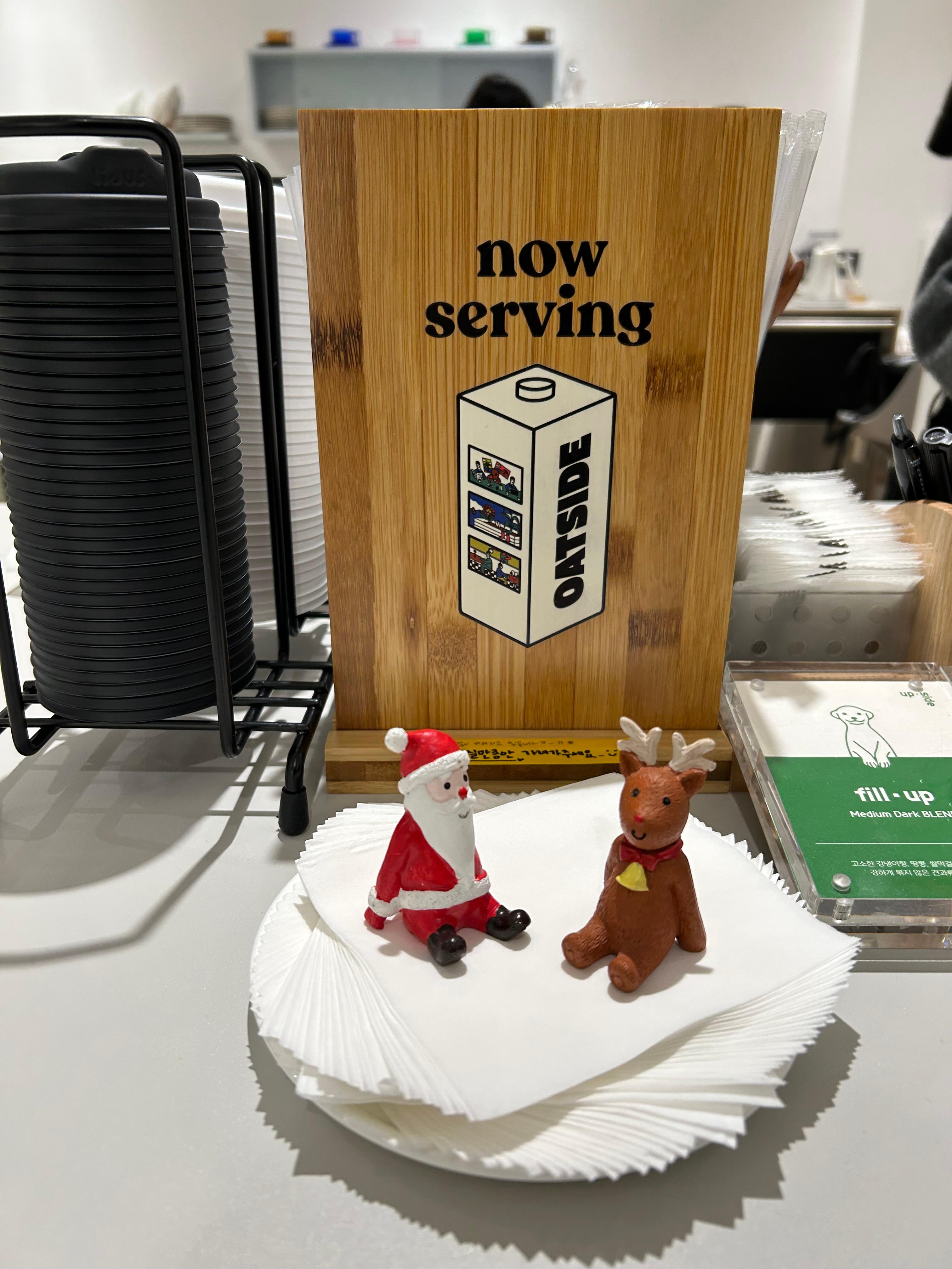 카페 내부는 군더더기 없이 정돈된 디자인으로, 곳곳에 귀여운 강아지 요소들이 숨어 있어 눈이 자주 가요. 의자, 컵, 티슈, 장식품까지 모두 통일감 있게 구성되어 있어 전체적인 완성도가 높은 공간입니다. 특히 창가 자리는 햇살이 잘 들어 사진 찍기 좋은 장소로 정말 인기예요. 요즘 SNS 감성 카페들이 많지만, 업사이드 커피는 억지로 꾸며낸 느낌이 아니라 자연스럽고 따뜻한 디자인이라 더욱 호감이 갔습니다. 조용한 음악과 은은한 로스팅 향이 더해져 편안함이 배가 되더라고요. 곧 크리스마스라 곳곳에 작은 소품들이 더 아기자기하고 좋았어요.