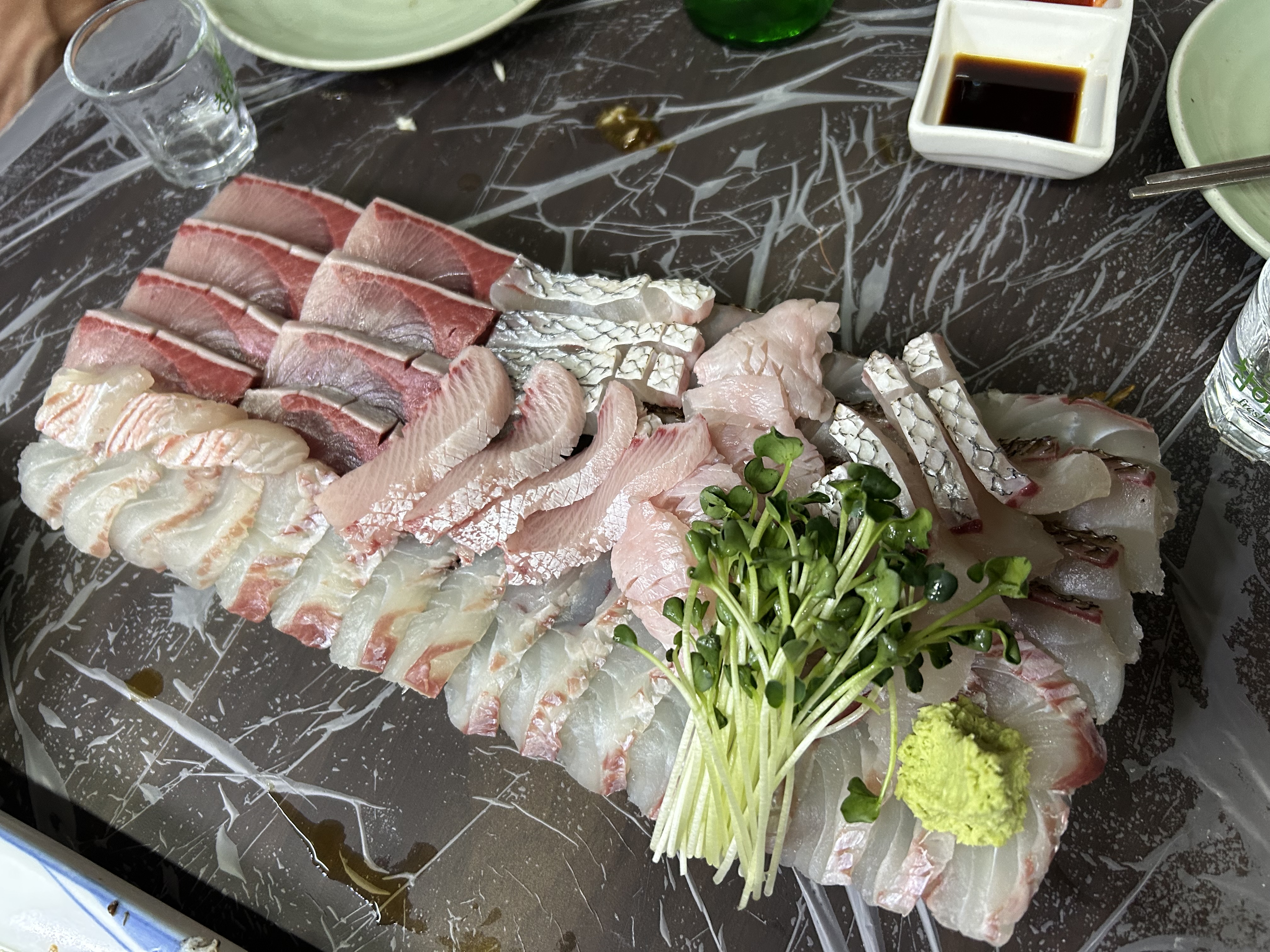 메인을 먹다보면 진짜가 나타납니다. 바로 회인데요, 이날은 제철생선인 방어, 자연산 광거, 도미 숙성회가 나왔어요. 사장님께서 생선 부심이 엄청나셔서 오랫동안 설명해주셨어요. 저는 활어회보다 숙성회를 좋아하는데 입에 넣는 순간 기름기가 적당히 오른 신선한 생선이 사르르 녹더라고요. 회를 그렇게 즐기지 않는 제가 먹기에도 맛있는 회였어요.
