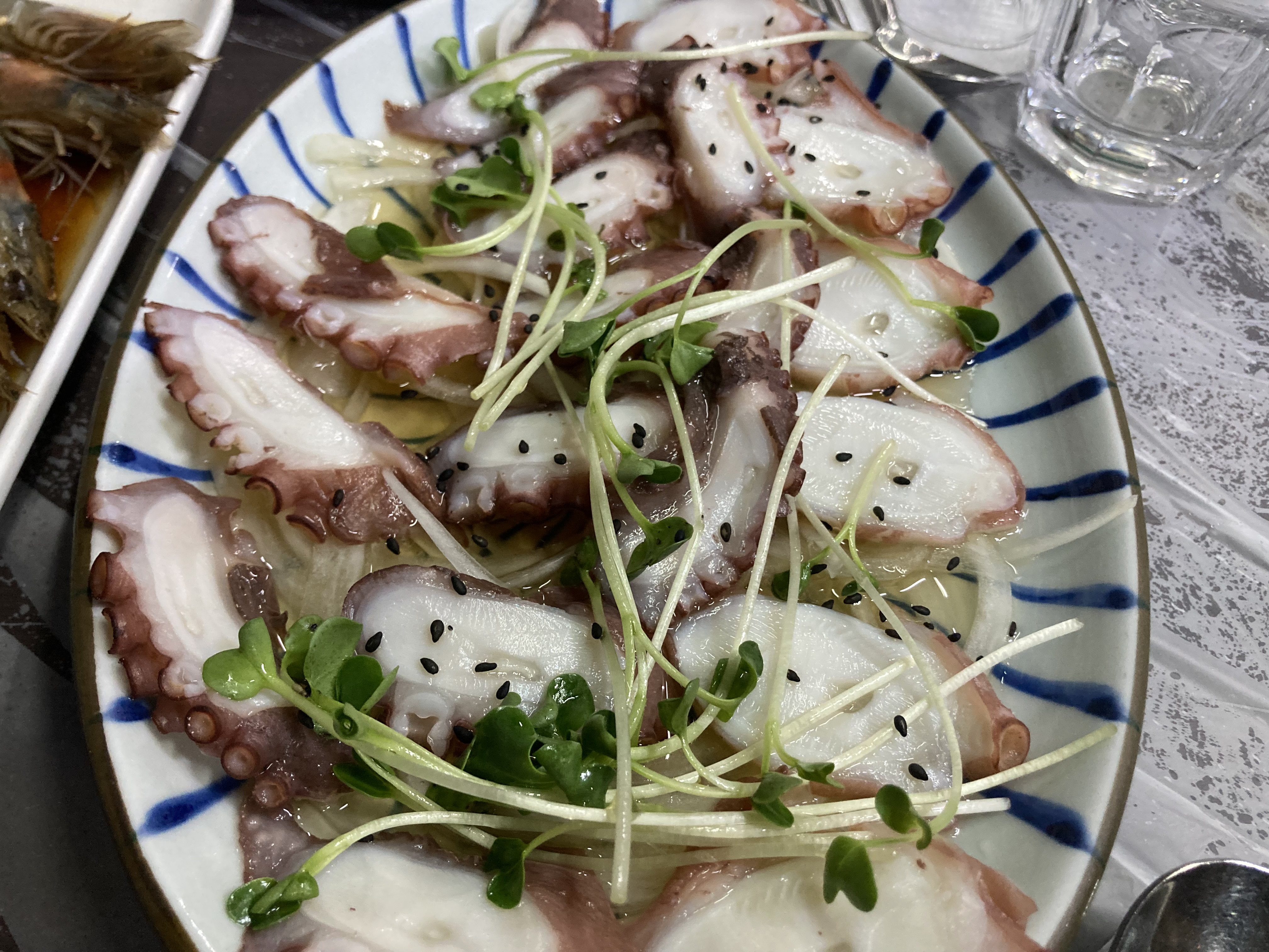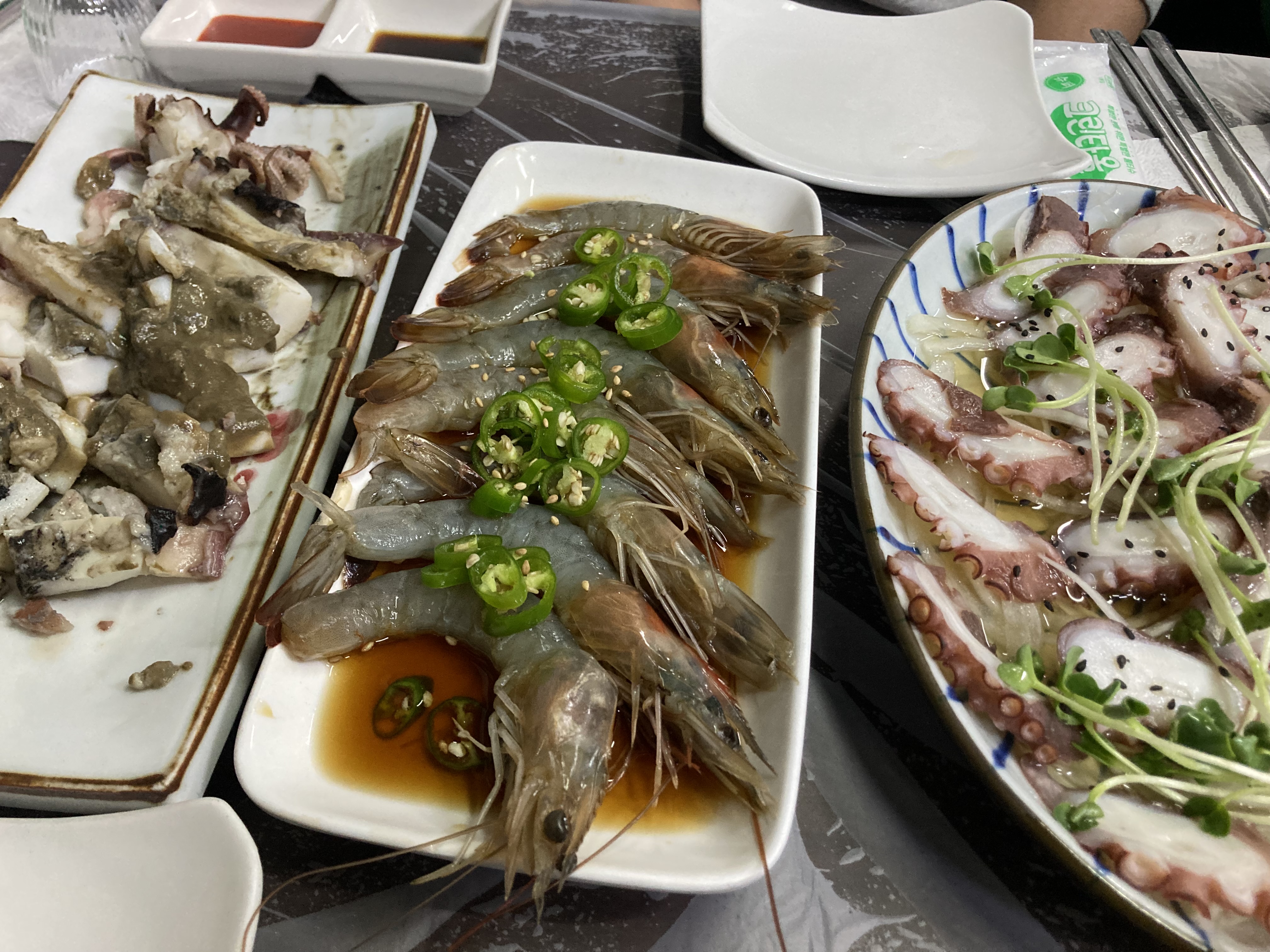 가진항의 대표 메뉴라면 역시 주인장 스페셜(50,000원)이에요. 첫 접시가 나오는 순간부터 ‘아, 제대로 준비했구나’ 싶은 비주얼에 감탄이 나오더라고요. 우선 문어초회로 입맛을 돋워줘요. 초회의 양념이 황금비율의 새콤달콤 소스가 곁들여져 적당히 잘 삶아진 문어와 너무 잘 어울려요 같이 간 지원인분은 저 초회 소스를 숟가락으로 한방울도 남기지 않고 다 떠드셨어요. 레시피를 알고 싶은 맛이었어요. 그리고 다음은 새우장인데 이건 밥 한숟깔 같이 주셨으면 하는 마음이 간절했어요. 앞으로 먹을 음식들이 많아서 꾹 참았지만 짜지 않고 새우가 진짜 쫀득거려요. 일단 에피타이져부터 이러니,, 메인 메뉴들은 말모였습니다.